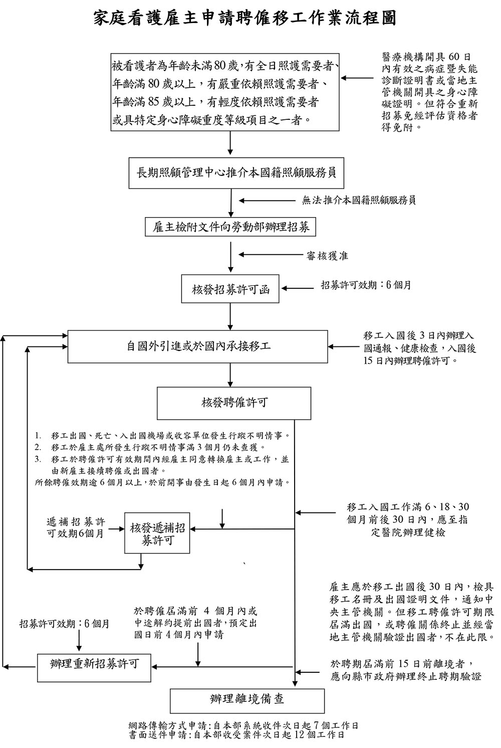- 外籍監護工期滿前四個月,雇主可辦理重新招募許可,惟仍須具備上述申請條件。