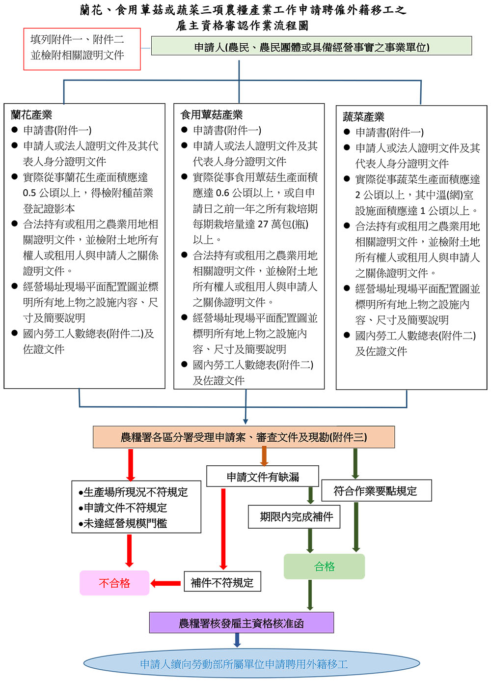 服務介紹 申辦資料 農林牧移工 農林牧移工 申辦流程(蘭花或食用蕈菇或蔬菜農糧產業) 申請書附件: 附件一、蘭花或食用蕈菇或蔬菜農糧產業申請聘僱外籍移工資格認定申請書 附件二、國內勞工人數總表 附件三、生產場所 現況會勘紀錄表 申請流程: 返回